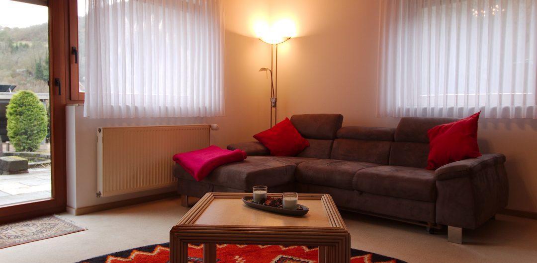 Die gemütliche Sofaecke und der direkte Zugang zur Terrasse sorgen für echtes Urlaubsgefühl im Lahntal.